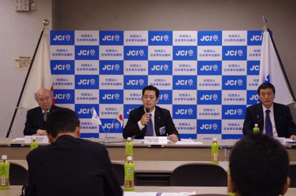 記者説明会で説明する(社)日本青年会議所 会頭 相澤弥一郎(中央)