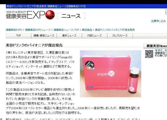 株式会社セレニティが販売するコラーゲンドリンク「esper30」http://www.esper30.com/の復活販売に関する記事が全研本社株式会社が運営する健康美容EXPOに掲載されました。