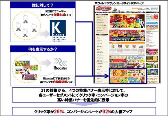 まず、顧客DB に蓄積されている属性データや「Rtoaster (TM)」に蓄積しているユーザーの行動データを「KXEN」にインポートすることで、自動的にユーザーセグメントが生成されます。生成された各セグメントに対して、複数の特集バナー(今回は31 個)を「Rtoaster (TM)」に登録しておくことで、表示されるコンテンツが自動最適化される仕組みとなっています。