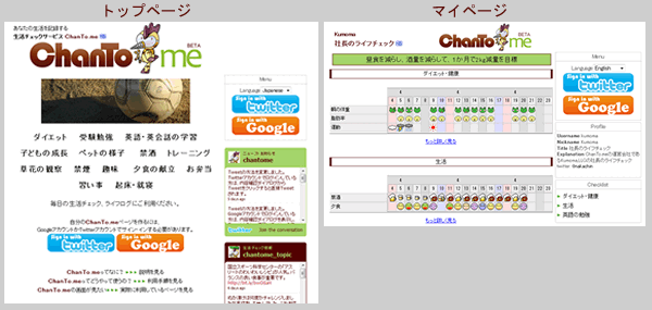 毎日の生活の中には、ダイエット、勉強、子供の成長、読書、運動、禁酒、禁煙など、チェックし記録したい事が多くあります。ChanTo.meはチェックしたい項目を自分で決め、毎日記録する事ができるWebサービスです。このサービスは、PCだけではなく、iPhoneとAndroidのWebブラウザにも対応していますので、外出時の記録も容易に行えます。チェックした記録を参照するためのユーザインタフェースとして、カレンダーとグラフの二種類をご提供しています。