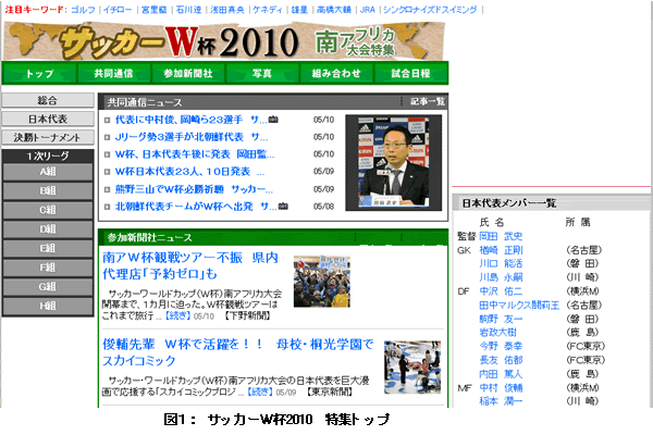 47NEWS(よんななニュース)<http://www.47news.jp/>では10日、「サッカーW杯2010 南アフリカ大会」特集ページをオープンしました。<http://www.47news.jp/sports/soccer/2010wcup/>