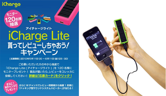 「 iCharge Lite (アイチャージ・ライト)貰ってレビューしちゃおう!キャンペーン」を開催します。2010年5月11日から募集を開始します。 たくさんの応募をお待ちしています。