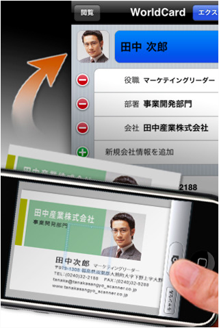 iPhoneはビジネスツールとしても豊富な機能を提供しています。お客様やお取引先の情報管理もiPhoneが提供する機能のひとつですが、たくさんの名刺の情報を手で入力するのは容易ではありません。 WorldCard Mobileは、iPhone 3GS用にデザインされた名刺スキャナーアプリケーションです。名刺をカメラで撮影すると、弊社独自のOCR技術で名刺の情報が読み取られて、自動的にiPhoneの連絡先リストに名刺の情報が追加されます。 WorldCard Mobileは、その認識率の高さ世界各国のユーザーの方に高い評価をいただき、全世界で12万回ダウンロードされています。日本のApp StoreでもトップセールスAppでは20位、ビジネスカテゴリーでは3位にランクされています。
