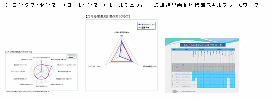 コンタクトセンターレベルチェッカーでは新たに設定した「標準スキルフレームワーク」に基づいて全国のコンタクトセンターにおける汎用的な適性・知識・スキルなど明確化し診断・分かり易く可視化するもの。これを利用することで、採用試験、スキル・知識レベル把握、人材育成・研修、適材適所配置、すぐ辞めない人材の把握や、今までは把握することができなかった全国平均と比較して各センターの組織の強み、弱みを人材面から全体的に把握できるようになる。