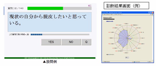 パソコン上で、わずか7分、144問の質問に答えるだけで、その場で瞬時に適性・適職が表示でき、公正で的確な、性格・適性分析が可能な診断ツール。