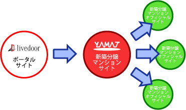 本サービスは、livedoorポータルサイト内に追加される”新築分譲マンション” (仮称)のテキストメニューをクリックするとヤマティーが運営管理する”新築分譲マンションサイト”(仮称)へ遷移します。
