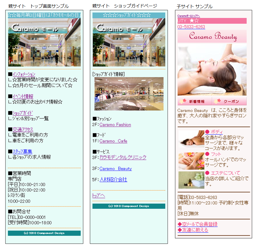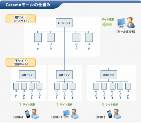 カラモモールでは、親サイトはモールの管理者が更新・管理を行い、子サイトは店舗で更新を行うことができます。特に、子サイトはPCまたは携帯から簡単にサイトを作成・更新できる仕掛けを提供。サイト全体をフレッシュに保つことができます。