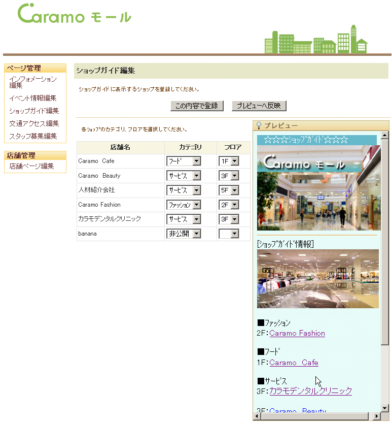 本ソリューション「カラモモール」では、従来は難しかった店舗毎のサイト更新を店舗の方が直接行えるようにしました。この仕掛けにより、多数の店舗サイトを包含するショッピングモールのサイトをよりフレッシュに保つことが可能になります。