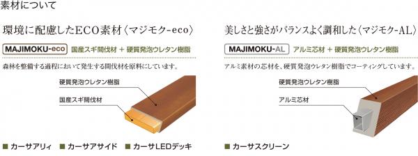 木目の美しさをガーデンやエクステリアで使用する場合、天然木では色あせや割れ、ささくれ、腐食などの問題がありました。新商品「カーサ」は、国産スギ間伐材とアルミ芯材を硬質発泡ウレタンで包みこんだ新素材<マジモク>を使用し、高い耐久性と安全性を確保した門柱・門まわりユニット、デッキです。
