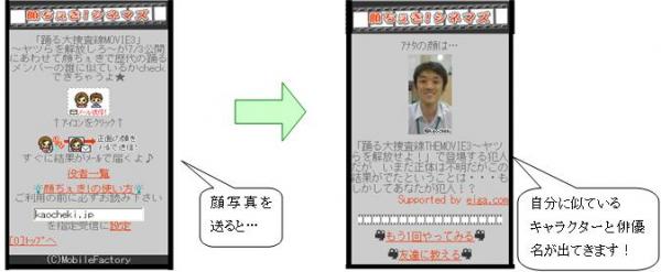 「顔ちぇきシネマズ」とは、携帯電話で撮った顔写真をサイトに送ると、「顔ちぇき!」の技術を使って、