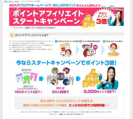 ポイントアフィリエイトは、WILLER会員が個人で作成しているブログやホームページに、ポイントアフィリエイト設定ページで指定されるアフィリエイトコードを設置すると、そのコードを経由して購入されたウィラー・トラベルの旅行商品の代金に対して1%のWILLERポイントを獲得できます。ウィラー・トラベルはポイントアフィリエイト導入に合わせて、スタートキャンペーン(http://travel.willer.co.jp/x/bus/dynamic/3/ja/html/pc/affiliate/)を実施し、対象期間においてWILLERポイントを通常の3倍付与します。