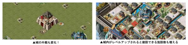 来る5月26日(水)メンテナンス終了後より城を4レベルまで拡張できるアップデートを実装いたします。アップデート後は特定の条件をそろえると城を4レベルに拡張する事ができるようになります。レベル4に拡張すると城の概観が変わり、城内に建設できる施設数や、各施設のレベル上限があがります。