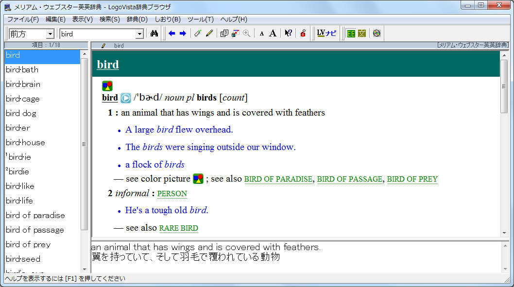 本製品は、アメリカで最も売れている卓上辞書を出版しているメリアム・ウェブスター社の英語学習者のために編纂された英英辞典です。英語学習が上級に進んでいくと、微妙なニュアンスや場面に応じた適切なボキャブラリーの選択など、いっそう深く英語を知るための英英辞典が不可欠です。『メリアム・ウェブスター英英辞典』は、英語をマスターするために必要な最新の詳しい語彙や文法が使われています。また収録されている約10万語は3,000の基本的な語彙だけを使って記述されているなど理解しやすい工夫がされています。さらに16万以上の用例、2万2,000以上の慣用表現が使われていて、学習に役立つ十分な情報量を収録しています。