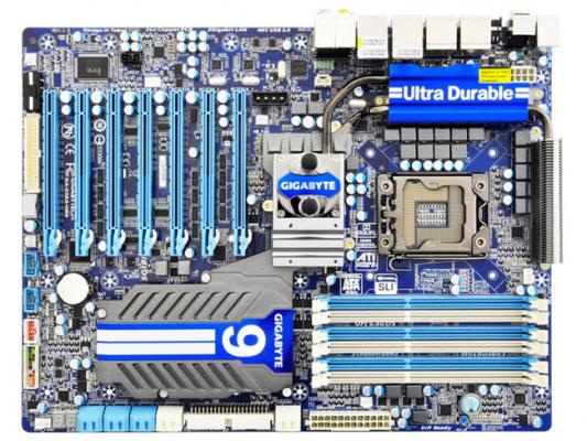 GA-X58A-UD9は、Intel Core i7プロセッサに対応したIntel X58 Express チップセットを搭載しています。最新の6コアCPUに対応しています。従来のフロントサイドバスはQuick Path Interconnect(QPI)に換わり、25.6GB/秒の転送速度(FSB 1600MHzの2倍の帯域幅)でプロセッサとチップセットの間のコミュニケーション・ボトルネックを解消します。また、Core i7プロセッサは、メモリコントローラー内蔵で、トリプルチャンネルDDR3を実現します。