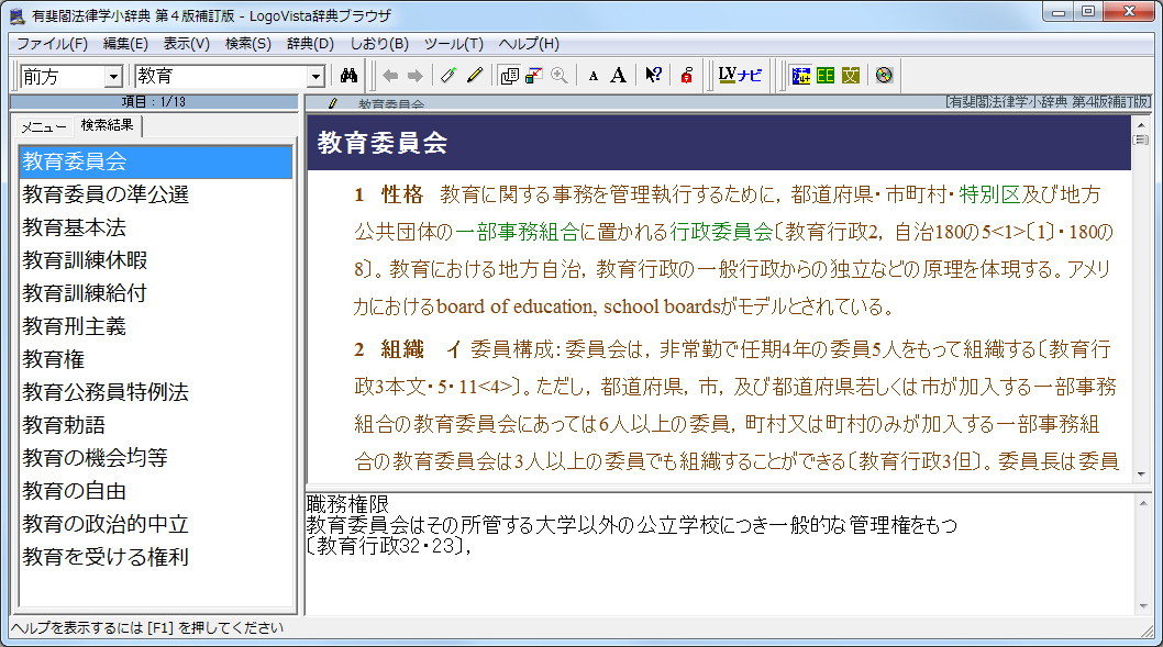 今回特別に無償で同梱される「法令検索」では、六法を含むすべての法令(憲法・法律・政令・勅令・府令・省令)7,544 法令を検索・閲覧できます。総務省行政管理局が官報を基に整備したデータを利用。法令名中の用語、五十音、事項別分類、法令番号からの検索と、条文中に該当の用語を含む法令を検索でき、正式な法令名称がわからない時でも目的の法令を見つけることが可能。また随時データのアップデートを行なうことで、常に最新の法令を閲覧でき、紙の法令集にはない簡易性と利便性を提供します。