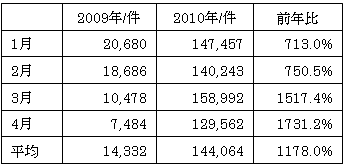 2010年1月は「147,457件」、2月「140,243件」、3月「158,992件」、4月「129,562件」