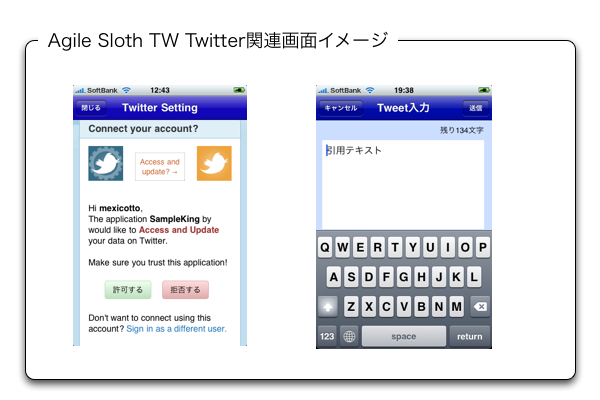 Agile Sloth TW(アジャイルスロース TW)は、スマートフォンアプリケーション(iPhone/iPad/Android)に おいて、Twitter連携機能を低コスト・短工期で実現する為のソフトウェアライブラリ製品です。