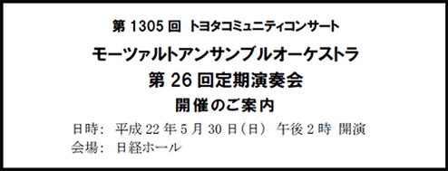 東京都トヨタ販売会社グループとトヨタ自動車株式会社(以下、トヨタ)は、5月30日(日)に日経ホールにて開催される、モーツァルトアンサンブルオーケストラによる「第26回定期演奏会」を「トヨタコミュニティコンサート」の一環として協賛する。当コンサートは、日ごろ音楽を聴く機会の少ない方々に、気軽に音楽に親しんでいただく目的で、客席の一部を招待席とする。