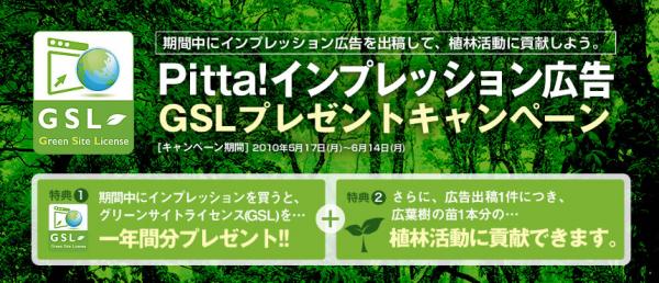 世界初のホームページの環境認証サービス 「グリーンサイトライセンス」を運営するラウル株式会社(本社:東京都新宿区、代表:江田健二)は、広告マーケットプレイスPitta!を運営する株式会社 デジタライズ(広島県広島市、代表取締役:藤本英俊)とコラボレーションを実施し、GSLプレゼントキャンペーンを2010年5月17日より開始いたします。