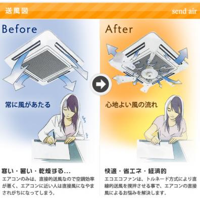 ◎エコエコファンはトルネード方式により直線的送風を撹拌させることで、エアコンの直接風によるお悩みを解決します。