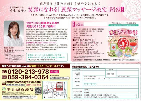 創業昭和21年 平井鍼灸療院 二代目鍼 灸師・薬剤師の清水良子が 講師として開催します。日々の施術のノウハウを凝縮し、東洋医学発想に基づいた健康美 を テーマに開発した経穴(けいけつ)マッサージと和漢配合赤龍(せきりゅう)クリー ムで健康と美肌を体感していただきます。