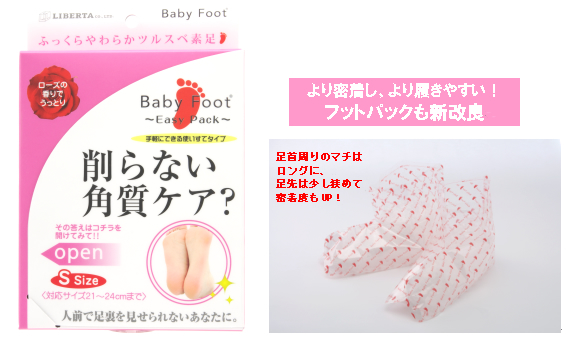 素足と出すことが増える夏に向けて、足裏のかさかさが気にする人が増える季節となりました。そんな足裏のかさかさの原因となる角質を削らずに自然に落とす、削らない角質ケア「ベビーフット」を展開する株式会社リベルタ(代表取締役・佐藤透)は、「ベビーフット」シリーズから21~24cm対応のスモールサイズ、「ベビーフット イージーパックSP Sサイズ」を2010年6月30日(水)より順次全国(*1)で新発売致します。