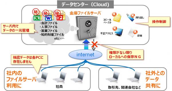 従来のファイルサーバへの操作性を変えずに、金庫ファイルサーバにて、情報の持ち出しを完全に制限する業界初のサービスとなります。