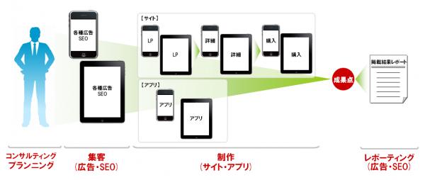 スマートフォンやiPad を所持するアーリー・アダプター層をターゲットとし、戦略的な広告出稿コンサルティングをはじめ、広告クリエイティブ、スマートフォンやiPad 向けサイト・ランディングページ・アプリの企画・制作、SEO による集客までをトータルパッケージサービスにて提供いたします。