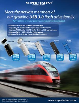 ユニバーサル・ビジネス・テクノロジー(本社 千代田区、東京)は、米国Super Talent Technology Corporation(本社 米国カリフォルニア)のSuperSpeed USB3.0 Drive (USB3.0メモリー) のカスタム/OEM販売を開始します。 USB3.0メモリーは、従来のUSB2.0メモリーに比べてデータの読み書きのスピードが速く、映像系のコンテンツやハードディスクのバックアップなど大容量のデータをより短い時間でUSB Drive(USB3.0)メモリーにコピーしたり、持ち運んだり、或いはシステムに組み込んだり、といったアプリケーションに向いています。 SuperTalent社はUSB Drive(USB3.0メモリー)の開発、販売をいち早く行っており、そのSuper Speedシリーズは、小さな筐体ながら1個あたり16GBから256GBまでの容量を揃えています。 データの読み書きスピードは、Read (最大 67MB/s ~ 371MB/s) Write (最大 25MB ~ 196MB/s)を実現しています。
