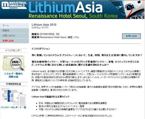 「Lithium Asia 2010」の情報を提供するとともに、会議の参加のお申し込みを承っております。