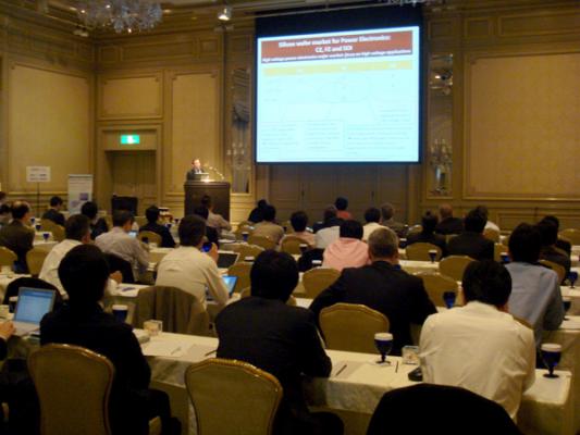 フォーラムではSiC材料、ウェハーの導入に関する考察やGaN材料の可能性、先端Si技術の応用に関する世界各国主要各社による解説とパワーエレクトロニクスのグリーン技術対応に於ける課題とその展望について議論が行われました。14名の講演者からは各種エンドアプリケーションにおける材料の市場展開スピードの予測、SiCベースJFETの仕様、大型パワーモジュールへの熱対応技術等の詳細解説が行われるなか、1社からは過去6年間のSiC基盤生産が倍増、材料価格面では8年前と比較して6割減、今後の150ミリ(6インチ)生産についても平方センチあたり5ドル以下が目標とされる解説が注目を集めました。