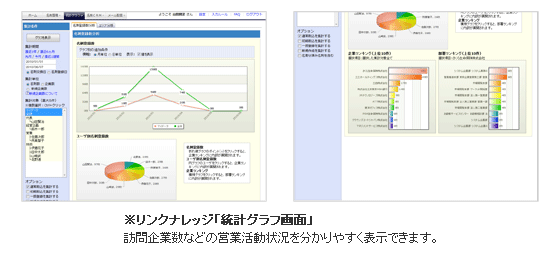 各営業担当者が顧客とのコンタクト情報を蓄積することにより、経営層にタイムリーな情報共有が可能となりました。新規訪問数などの活動状況もグラフで確認 することができます。