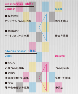 空いている展示ブー スやレンタルスペースを紹介することで展示会やイベント会場を探しているデザイナーに告知することができます。デザイナーからの申込を受け付けて直接 やり取りができるまでをサポート。