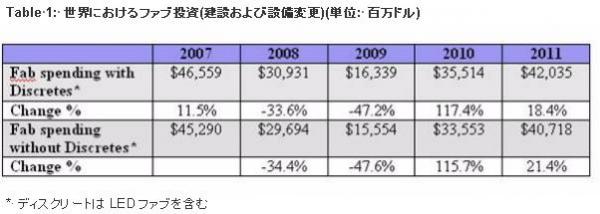 ファブへの投資が今年二倍になるといってもまったく驚きではありません。遡ること2009年6月、SEMIはWorld Fab Forecastにおいて、60%にものぼる2010年の高い成長率をいち早く予測していました。最新のレポートでは2010年のファブ投資は117%に達すると予測されています。この記事が公表されている現在においてさえ、更なる設備投資増額の発表がされるという風評があり、これが実現すれば成長は117%以上に押し上げられることになります。しかしながら、この迅速な拡大には高まりつつ懸念が影を落としています。Table 1はLEDファブを含めて、ディスクリート有無でファブへの投資を分類したものです。