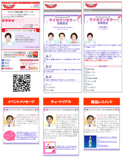 肌の悩みに応じて表示する「イベントお知らせ」「おすすめ商品レコメンド」「サイトのサービスや使い方のチュートリアル」のほかに、ポイント取得で変わるランクを知らせる「割引ランクお知らせ」や、マイカウンセラーのお悩みコラムを通して購入したユーザーに表示する「購入フォロー」メッセージなど、従来のモバイルECサイトにない「接客」を携帯システムの中で実現しました。
