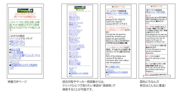 『ポケット英辞郎』では2010年6月11日(金)~7月11日(日)に南アフリカで開催される「2010 FIFA ワールドカップ」期間中、出場国の国名やサッカー用語を用いた英語の例文・言い回しをたっぷりご紹介する特集コーナーを提供。一般的な単語から専門用語まで幅広い英単語を収録している『ポケット英辞郎』ならではの一味違ったアプローチでワールドカップを盛り上げます。