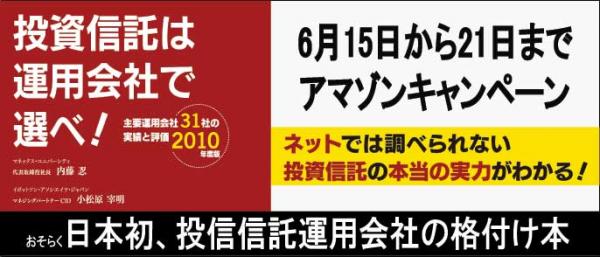 株式会社ユナイテッド・ブックス(代表取締役:神澤 享裕 / 所在地:東京都新宿区)は、内藤 忍/小松原 宰明 著『投資信託は運用会社で選べ!--主要運用会社31社の実績と評価2010年度版』の6月15日発売を記念して6月21日(月)までアマゾンキャンペーンを実施いたします。