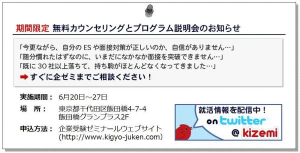 企ゼミでは、2010年4月より期間限定として実施してきた「無料カウンセリング・プログラム説明会」について、就職活動で苦戦している大学4年生や大学院修士1年生からの問い合わせが増えている状況に応え、6月以降も引き続き実施することに決定いたしました。