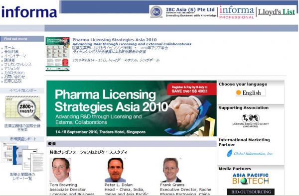 「Pharma Licensing Strategies Asia 2010 (医薬品業界におけるライセンシング戦略」の情報を提供するとともに、会議の参加のお申し込みを承っております。