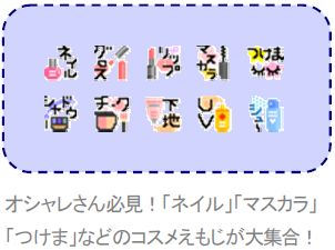 コンテンツ内容:オシャレさん必見!「ネイル」「マスカラ」「つけま」などのコスメえもじが大集合!