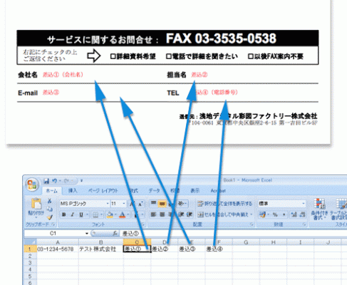 「1通毎に異なる文字列を原稿の本文中に差し込んでFAXを送信する」機能です。