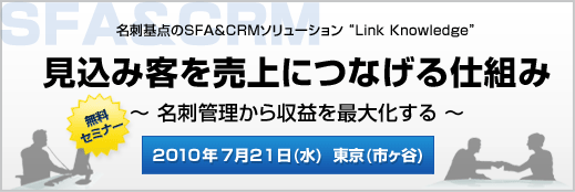 「Link Knowledge(リンクナレッジ)」は、ビジネスの起点である名刺をWEBクラウド上でデータベース化して人脈を可視化することにより、顧客管理や営 業情報の共有、マーケティング等につなげビジネスの可能性を広げ、最終的に収益を最大化することを目的とした、SaaS型新世代CRM&SFAソ リューションです。