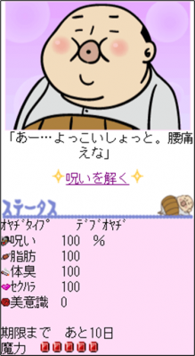 初期のデブオヤヂは「呪い」「脂肪」「体臭」「セクハラ」の各項目においてパラメーターの数値が100となっており、