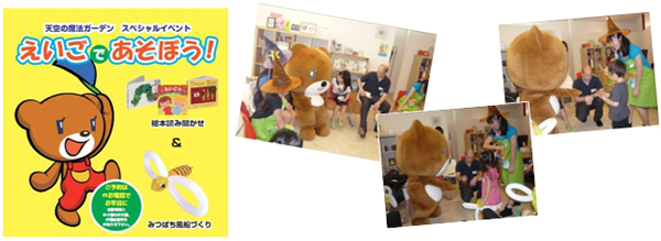 イベントの開始と同時に、子供向けインターネット学習システム「天空の魔法ガーデン(https://www.mahogarden.jp/)」に登場するクマのキャラクター“バブちゃん”が、子供たちの集まるクラスに突然現れたことで、子供たちはびっくりしつつも、すぐに仲良く遊びながら英語を学んでいた。