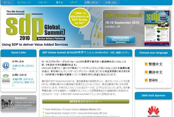 株式会社グローバル インフォメーションでは、皆様の利便性を図る為に、日本語、韓国語、中国語で「SDP Global Summit 2010 (SDP世界サミット)」の情報を提供するとともに、会議の参加のお申し込みを承っております。