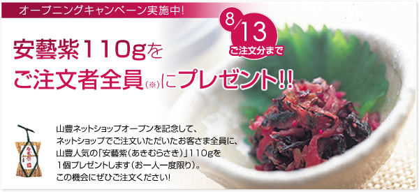 ご注文の方に「安藝紫(あきむらさき)110g」をもれなくプレゼント。また、会員登録された方にお買い物に使用できるショッピングポイントを500ポイントプレゼント。