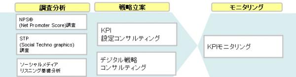 NPS(R)調査を活用した顧客ロイヤルティ分析をはじめ、ネットレイティングス株式会社(※)が提供するソーシャルメディアリスニングツール「BuzzMetrics(R)」を活用した口コミ分析を実施。現状把握から顧客戦略における課題を抽出し、自社サイトのメディア化やソーシャルメディアマーケティングなどのデジタル戦略立案からKPI 設定、継続的なKPI モニタリングのサポートまでをパッケージとしてご提供します。顧客戦略のPDCA サイクルを構築し、より強固な顧客ロイヤルティを生み出すことで、クライアント企業の成長をサポートいたします。