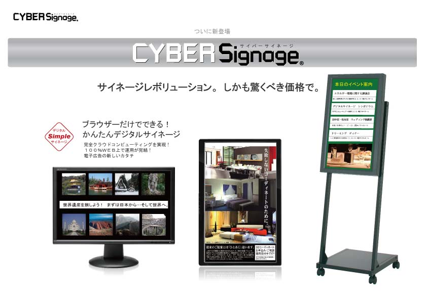 サイバーサイネージはコストや手間の垣根を取り払い、大企業から街角の商店まで、誰もが思いついたその日から電子看板=デジタルサイネージをご利用になれます。