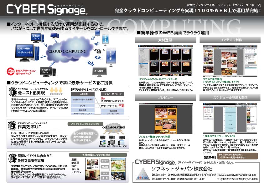 また、日本初(当社調べ)のサイネージサービスのオンライン決済型ネット配信ショップ『SJサイバーショップ』 (http://www.sofnetjapan.com/~shop/)も開設し、どなたでも、思いついたその日の内にデジタルサイネージをご利用になることが可能になりました。