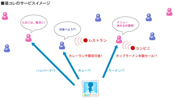 サービス利用・広告出稿ともに無料で、ビジネスマン・OLのランチタイム、主婦層の(自分の)お昼ごはん、休日ファミリー層のお昼ごはん等で、メニューに迷った際に気軽に利用してもらえることを期待すると共に、ランチ営業を行う飲食店、スーパー・コンビニ等の食品小売店等が出稿することによる、地域全体の盛り上がり・商店街の活性化等に貢献できるものと考えています。